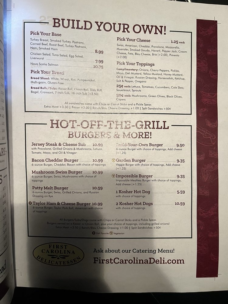 “ I will start this review by saying that full transparency, my family and I have been dining at First Carolina and what used to be its sister deli, Lox Stock & Bagel, for years and years and it is just as delicious now as it was the first time I dined there, over 20 years ago! I have yet to find a competitor in the area. There just isn't anything quite like it around. It's a classic style deli ambiance, with glass case items for order/purchase, but offers many dine-in options. The parking lot can be really painful, especially during peak times. (Lox Stock is better but can also be packed). And I wouldn't recommend parking at a nearby business and walking over due to the risk of towing (it's very close to UNCG so businesses are STRICT about this). The service is always wonderful, quick, and generally you're in and out. Ordering a takeout over the phone is also super simple and efficient. Now for the most important part. THE FOOD! Y'all, these sandwiches are DIVINE! I've literally never had a bad experience...ever. That says a lot as we come here nearly once a week. Here are my recommendations for must tries: -Arlington (pictured): Fresh, shaven Boar's Head turkey topped with melty Muenster cheese, topped with crisp lettuce and sliced tomato & creamy mayonnaise, on an onion roll. 10/10. Can't recommend enough. So simple, but so delicious. -Italian Sub: I struggle to choose between this one and the aforementioned masterpiece depending on my mood. You can get it cold or hot and I always go hot. It says a lot that I love this sandwich and it doesn't come served with mayo, but IMHO it really doesn't need it! The spice from the cherry peppers compliments the meat and toppings phenomenally. -Emerson: My mom's absolute favorite. It's shaved chicken with cheddar, lettuce, tomato & mayo on a sub roll. Unique and always hits the spot! Other suggestions: -Cheddar & Bacon Burger (yes! Trust me) -Pasta salad (beware if you're not a fan of olives, though) -Baked beans -Chicken salad (best in town, respectfully :)) -German potato salad If you're still reading, you must be a dedicated deli fan such as myself, which means you HAVE to give First Carolina (or Lox Stock) a try. You won't be disappointed! ”